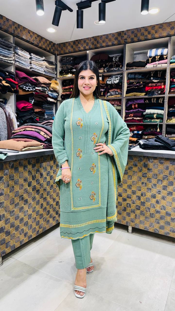 The soft knitted texture provides warmth while maintaining a graceful fall. A matching straight pant keeps the outfit balanced, and the coordinated dupatta is finished with embroidered borders that add quiet elegance. This set is ideal for daytime winter wear, casual gatherings, and composed festive moments.