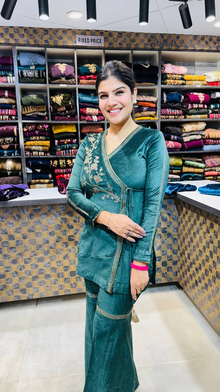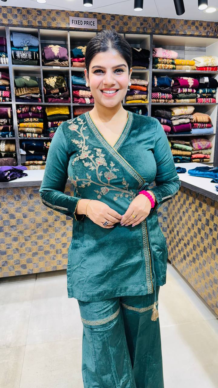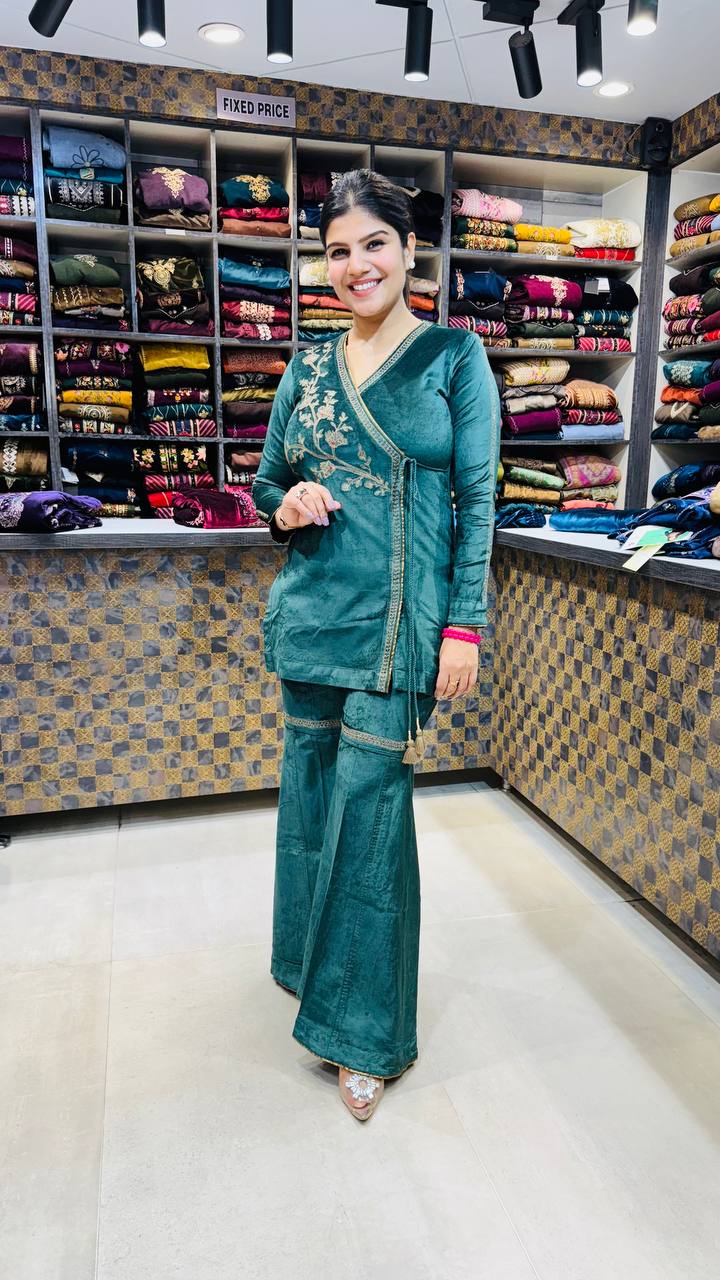 A stunning deep verdant green co-ord set crafted from premium cotrize fabric, offering a soft velvety texture with a luxurious sheen. The kurti features a stylish side-wrap pattern with elegant golden thread floral embroidery, paired with matching wide-leg trousers that complete the rich, festive look. Perfect for winter outings, gatherings, and elegant day events.