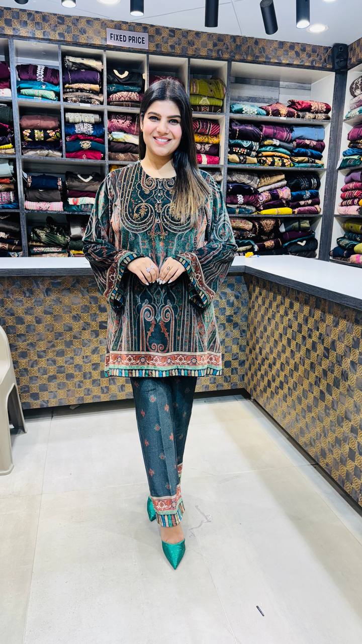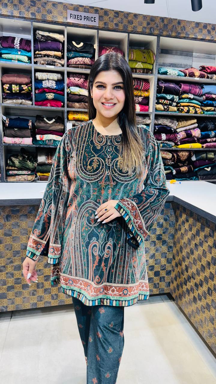 Verdure is a rich multi-tone premium velvet 2-piece set crafted in deep emerald green, teal, rust and gold accents. The kurti features bold ethnic baroque motifs, ornate borders and flared sleeves that give it a grand, artistic appeal. Paired with matching printed pants detailed with coordinated motifs and contrast borders, this outfit delivers a luxurious winter look with a regal charm.