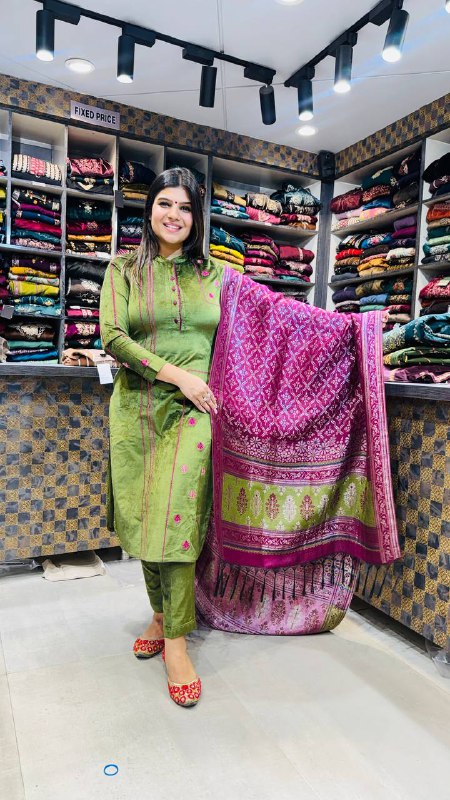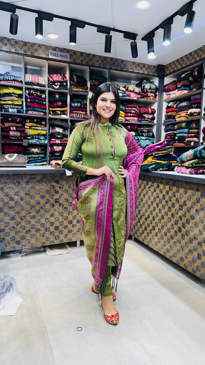 🎨 Colour: Olive Leaf Green with Berry-Magenta Contrast Dupatta