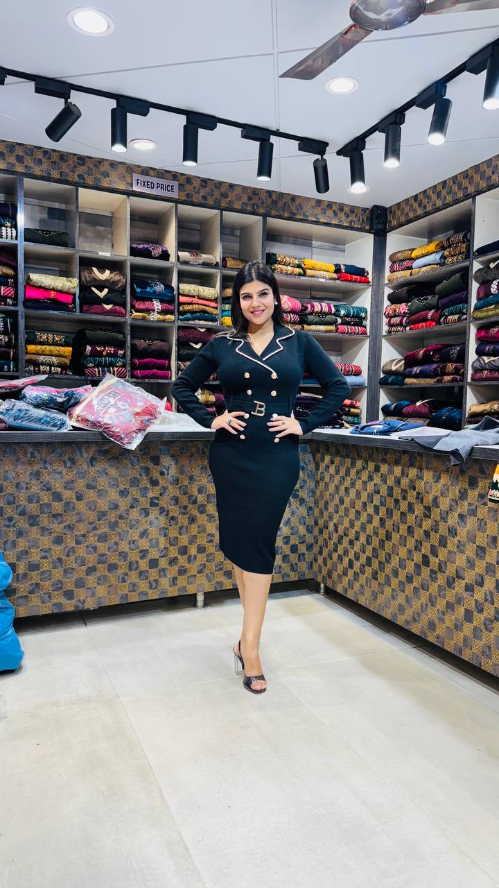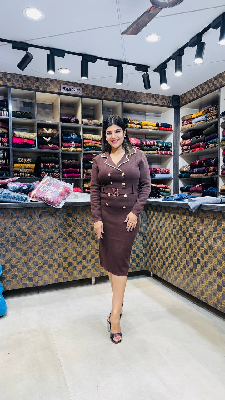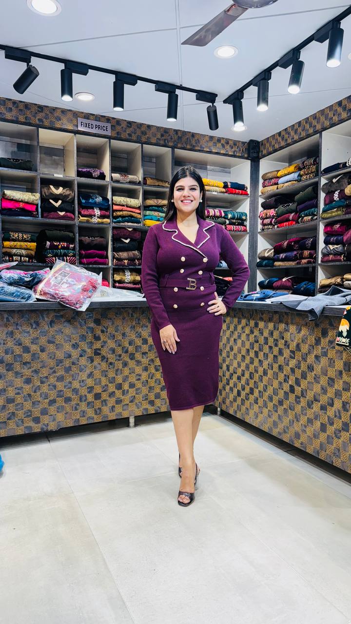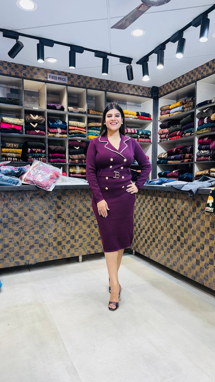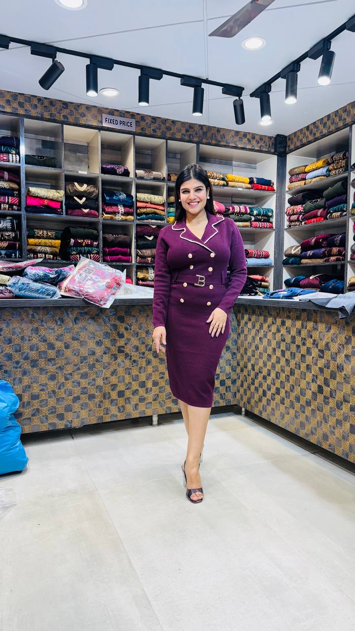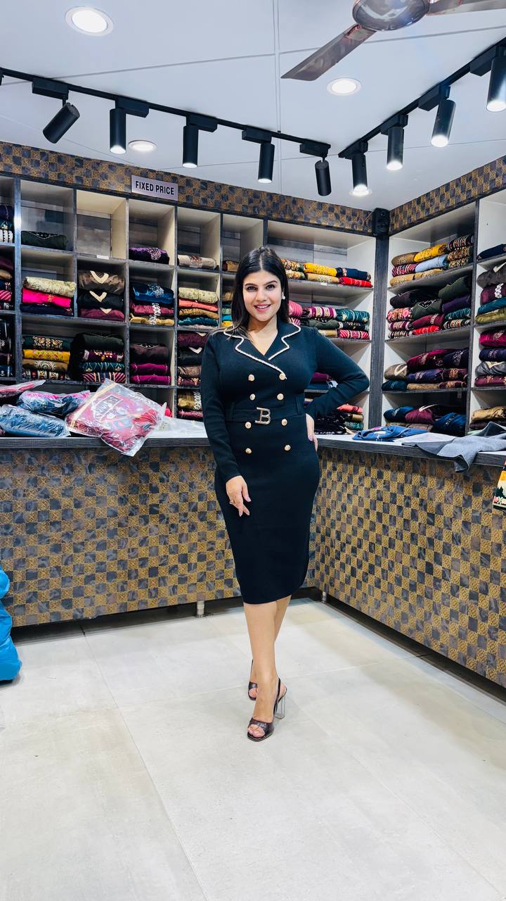 Elevate your style with this premium soft knitting dress, crafted for sophistication and comfort. Designed in a luxurious bodycon silhouette, it features elegant gold-tone buttons, a chic belted waist, and crisp contrast piping for a tailored finish. Available in three timeless hues — Midnight Black for classic charm, Wine Plum for a rich bold statement, and Mocha Brown for understated elegance — each shade brings out your confident, modern aura. Perfect for formal events, evening outings, or power dressing days.