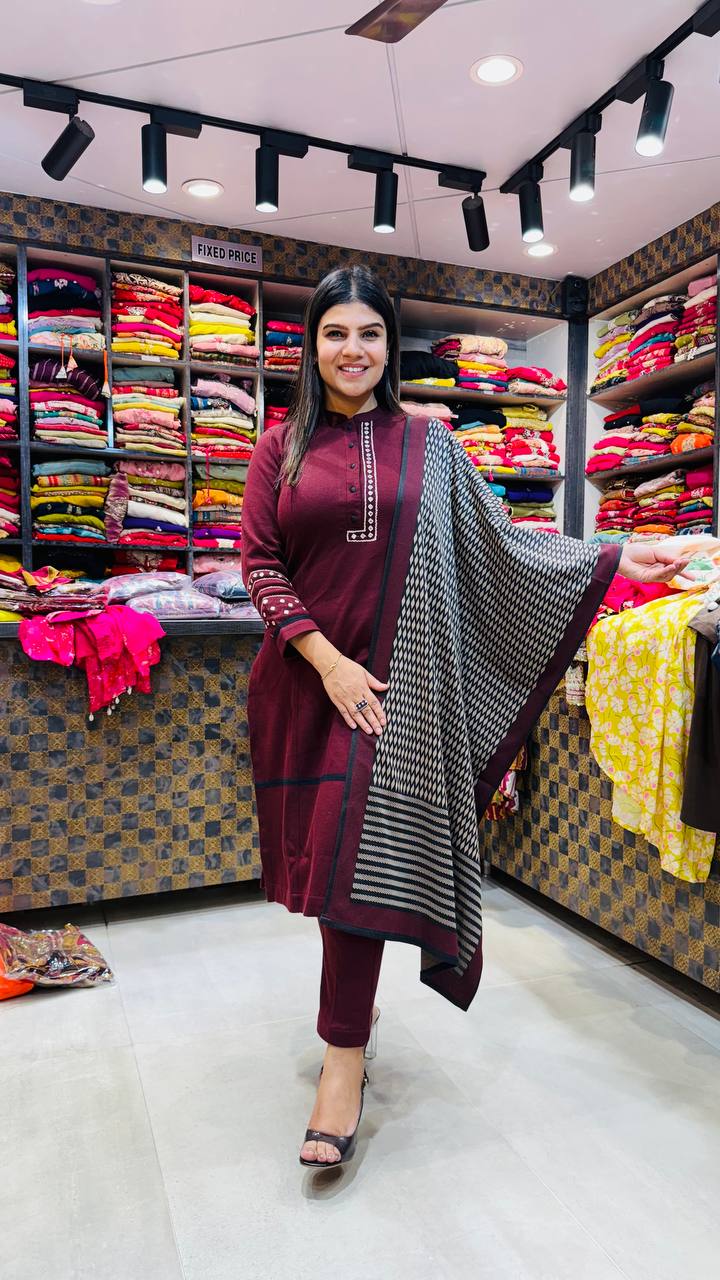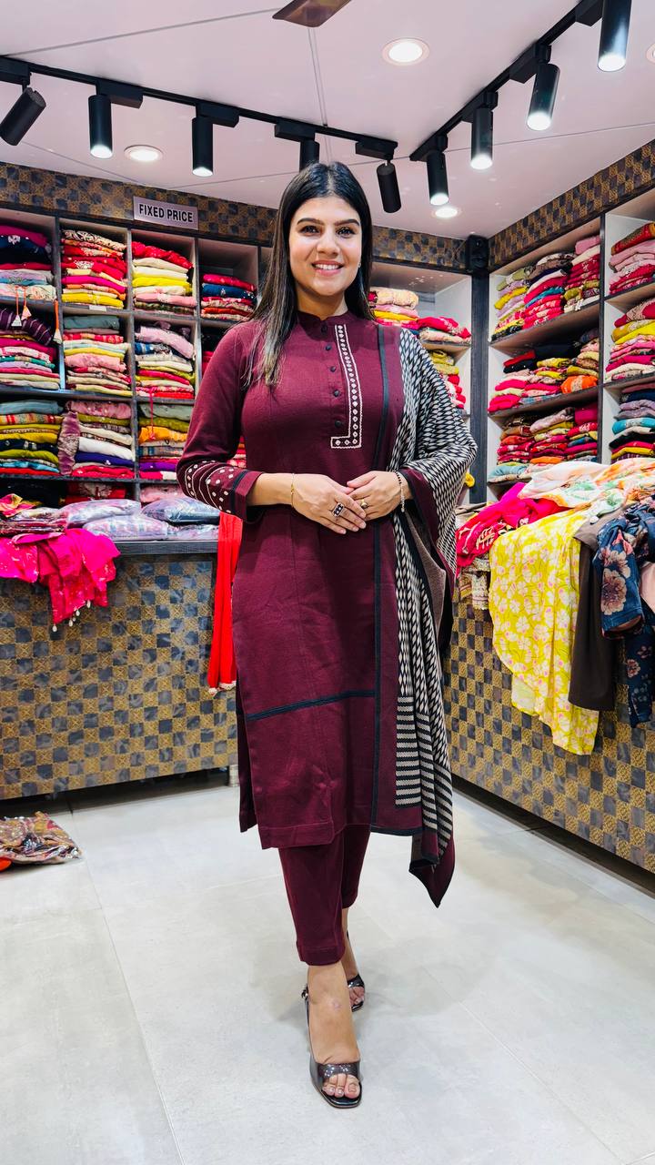Drenched in a deep wine hue, this elegant 3-piece set radiates understated sophistication. Crafted from soft knitting fabric, it offers luxurious comfort with a refined finish. The straight-cut kurta features minimal thread detailing and button accents, perfectly paired with matching pants for a sleek silhouette. The striped dupatta in monochrome tones adds a modern contrast, completing the look with effortless grace. Ideal for semi-formal gatherings, office wear, or elegant day outings β€” this ensemble beautifully blends comfort with chic appeal.