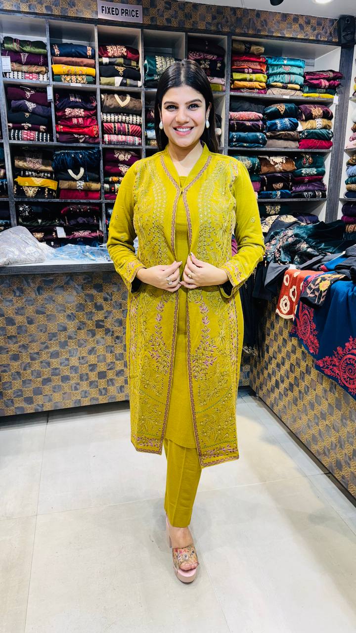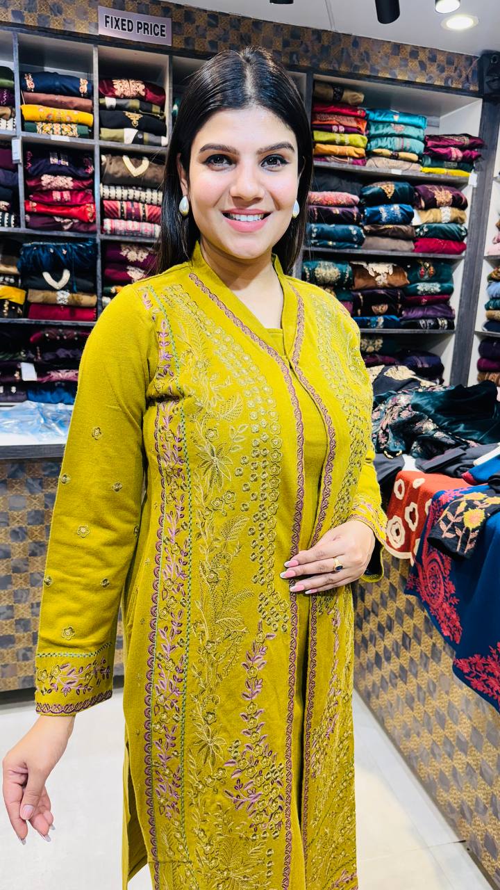 Zafira is a Premium Knitted 2-Piece set in a rich mustard-gold tone, designed to bring warmth with refined elegance. The long knitted shirt features delicate all-over thread embroidery with floral vine patterns, highlighted by a structured front panel and embroidered borders that add depth without overpowering the colour.
