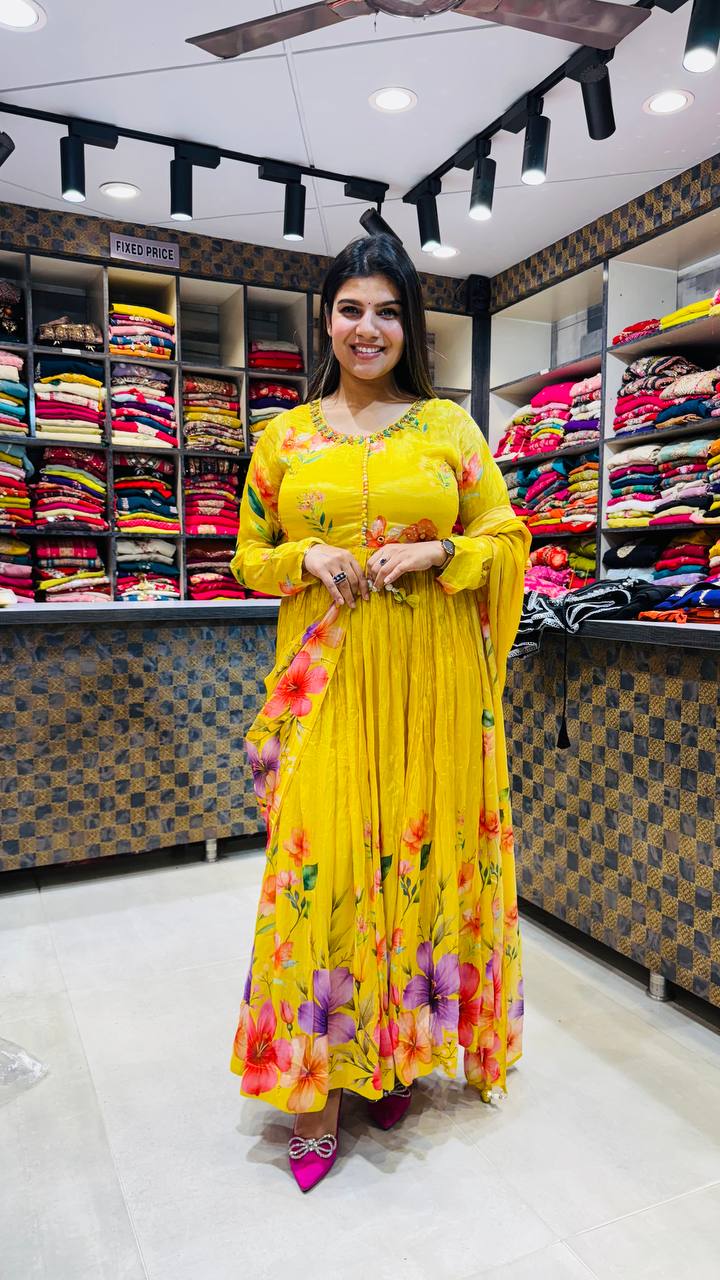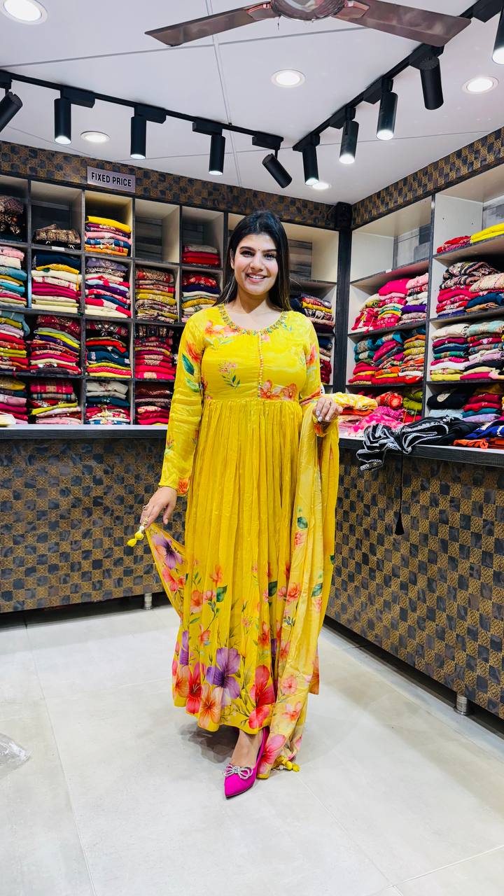 Radiate sunshine in this stunning Premium Crape Anarkali suit featuring a vibrant mustard yellow base adorned with multicolour floral digital prints. The flowy silhouette gives an effortlessly graceful look, while the delicate floral detailing along the neckline and hem adds a fresh, feminine charm. Perfect for festive mornings, haldi functions, or casual celebrations where comfort meets elegance.