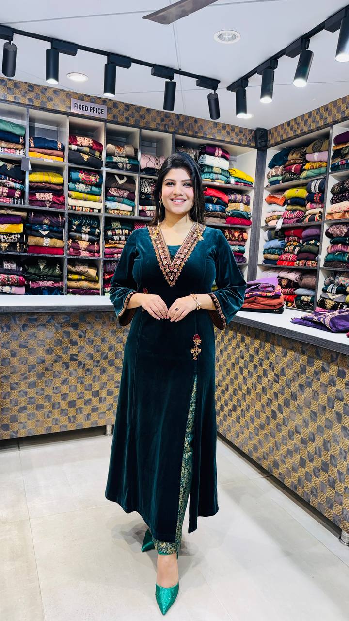 Zafreen is a premium velvet ensemble crafted in a deep emerald teal tone, designed for rich winter elegance. The shirt features a refined V-neckline adorned with intricate antique-gold and maroon embroidery, extending subtly across the cuffs and side motifs for a balanced, regal finish.