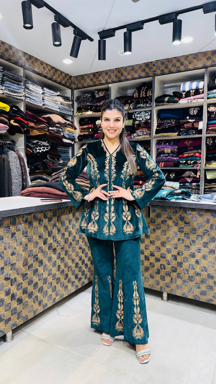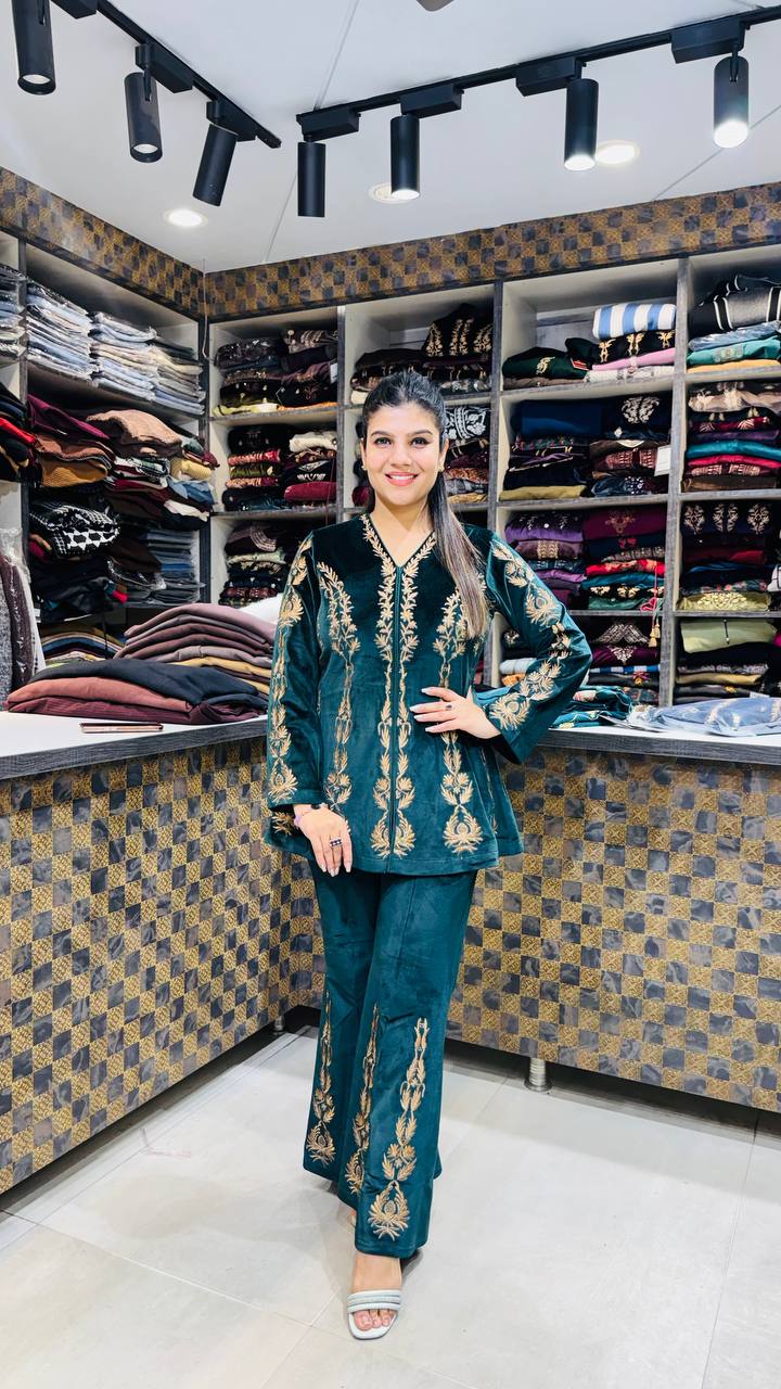 Zafreen is a premium velvet ensemble crafted in a deep emerald teal tone that instantly signals richness and winter luxury. The shirt features symmetrical antique-gold embroidery running vertically across the front and sleeves, creating a regal, elongated silhouette.
