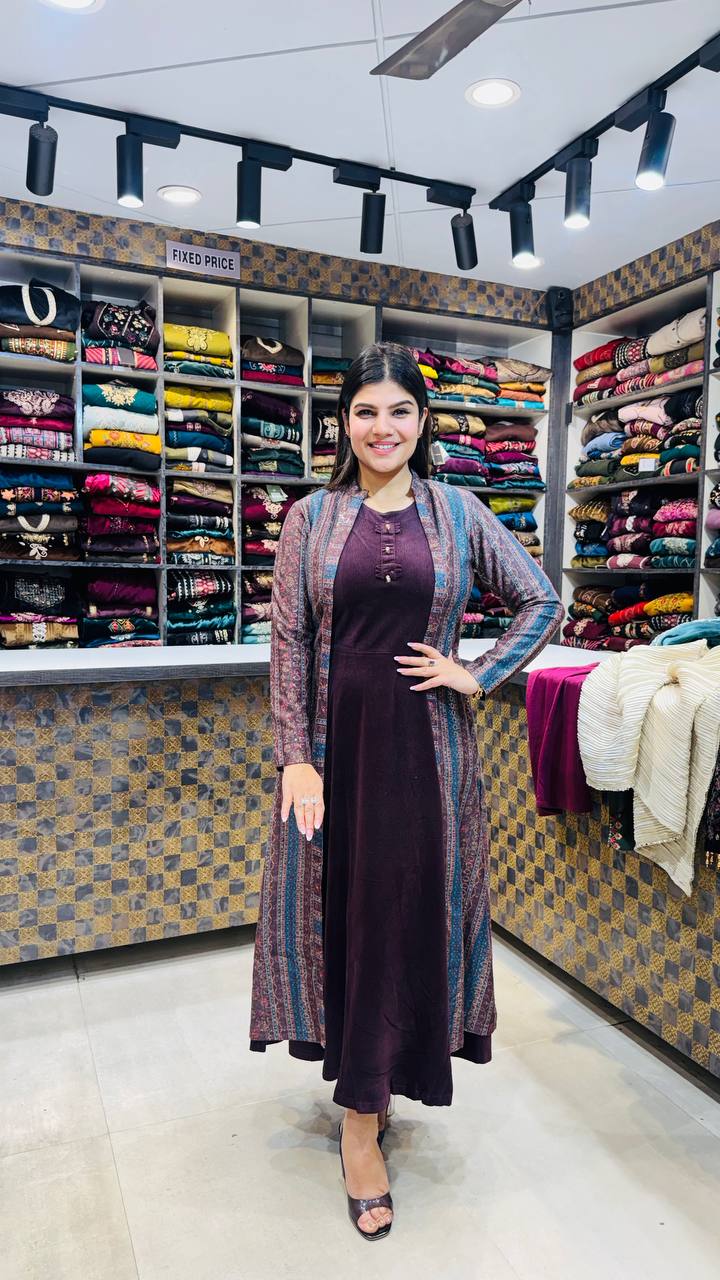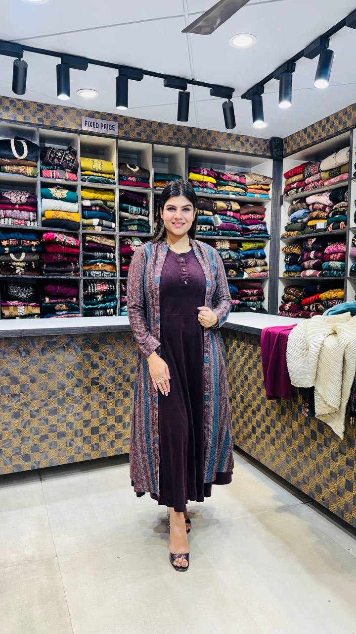 Zafrina is a Premium Imported Velvet 3-Piece ensemble crafted in a deep aubergine–plum tone that feels rich, fluid, and winter-perfect. The inner dress is made from smooth, solid velvet with a clean, elongated silhouette that adds effortless elegance.