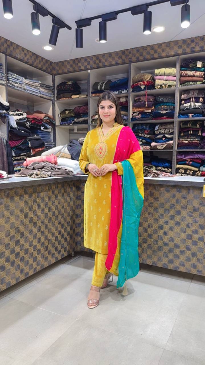 The matching velvet pants keep the look balanced and refined, while the contrasting dupatta in vibrant pink and teal brings a lively pop with subtle detailing. Soft, plush, and luxurious — designed for winter festivities and statement ethnic wear.