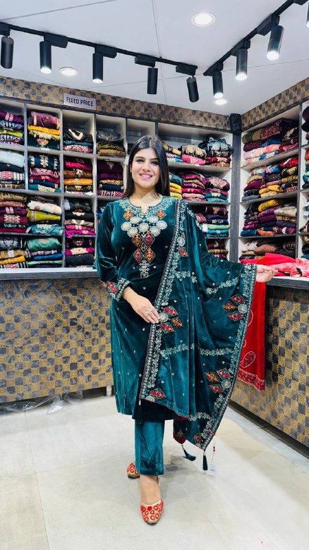 β¨ Design: Embroidered Neckline & Sleeves β’ Detailed Borders β’ Matching Velvet Pants β’ Ornate Velvet Dupatta