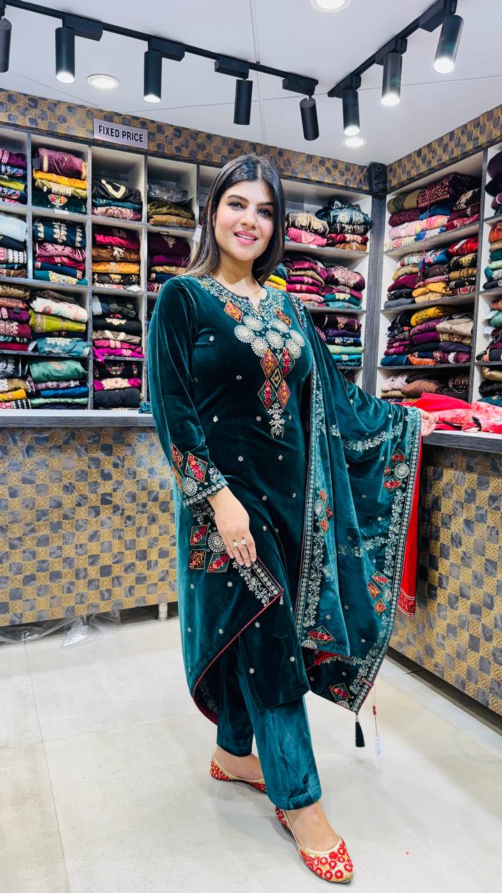 Zamrud is a Premium Velvet 3-Piece suit crafted in a deep emerald-teal green tone that instantly feels rich and winter-ready. The velvet shirt is adorned with intricate multicolour thread embroidery across the neckline, sleeves, and borders, blending jewel tones with fine detailing for a regal finish.