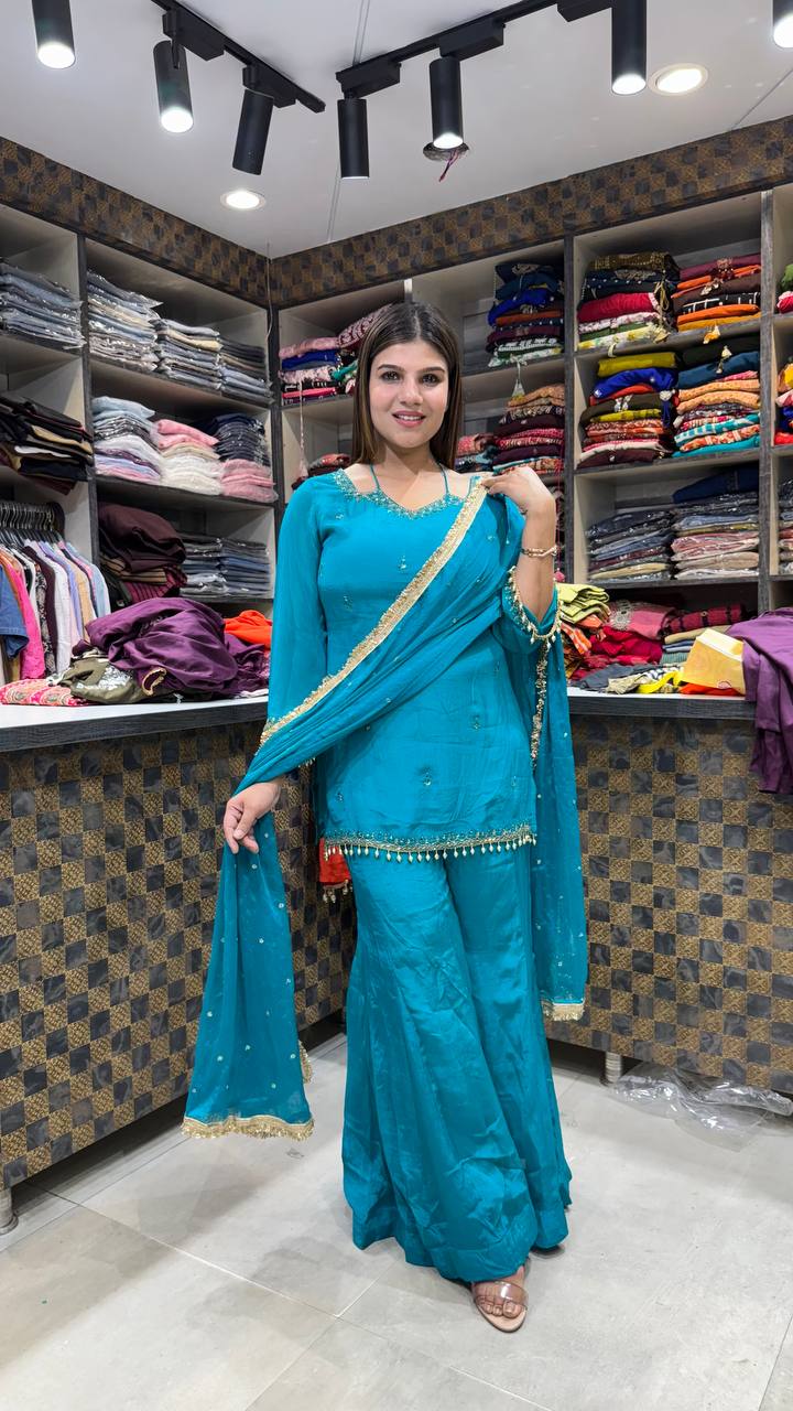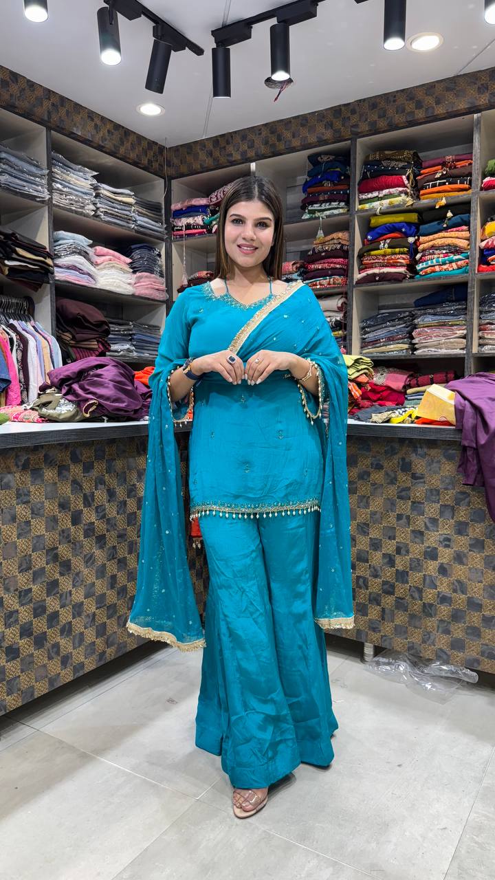 Zariya is a Premium Chinon 3-Piece suit in a rich teal turquoise shade, designed to make a graceful yet striking statement. The shirt features delicate embellishment along the neckline and subtle scattered detailing across the front, adding refined sparkle without overpowering the look.