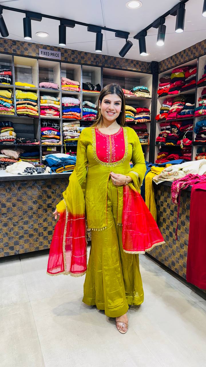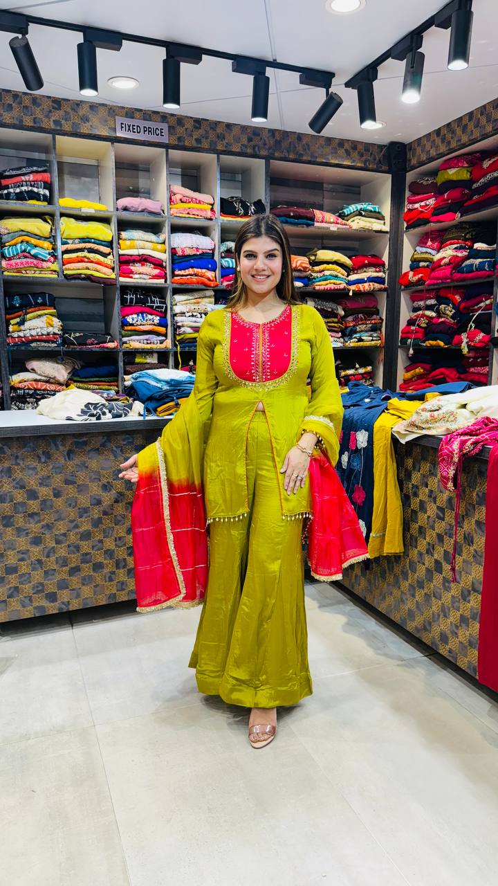 A striking 3pc ensemble crafted in luxurious premium Chinon, designed in a bold lime green base that instantly captures attention. The shirt features a contrasting hot pink embroidered neckline panel, enriched with delicate detailing that adds festive charm. The front slit cut enhances movement and gives a contemporary edge to the traditional silhouette. The matching wide-leg pants create a graceful, flowy fall, while the vibrant pink dupatta with subtle border accents completes the look with a balanced pop of color. Perfect for festive gatherings, celebrations, and statement day events.