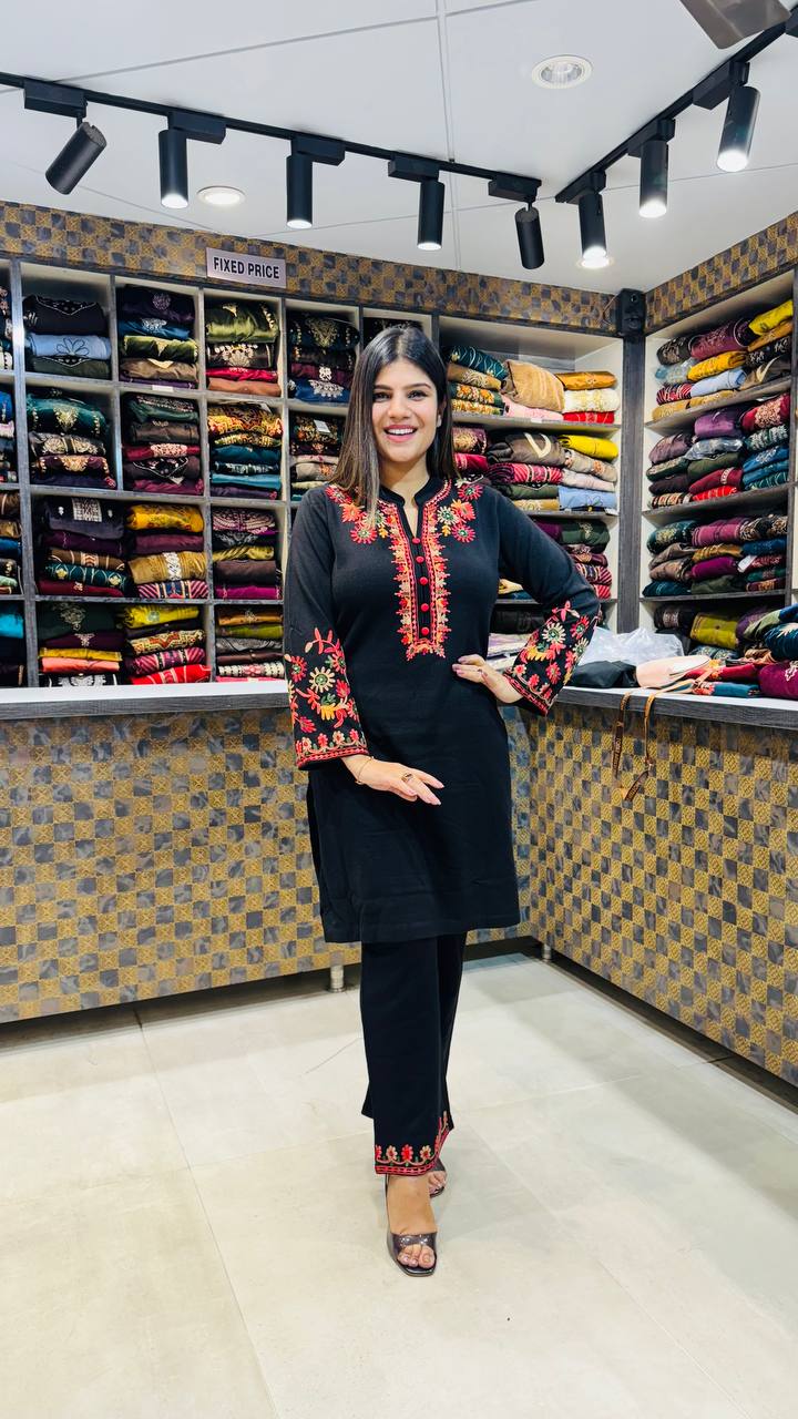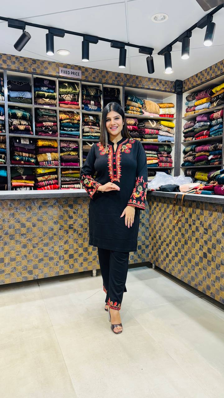 Zarqaa brings a bold yet elegant charm with its rich jet-black base paired with vibrant Kashmiri kadhai in red, orange, and green threadwork. The premium knitting fabric offers a soft, comfortable fall, making it perfect for all-day wear. The intricately embroidered neckline, statement sleeves, and matching pant hem give this 2-piece co-ord set a traditional yet modern appeal β ideal for casual outings and festive moments.