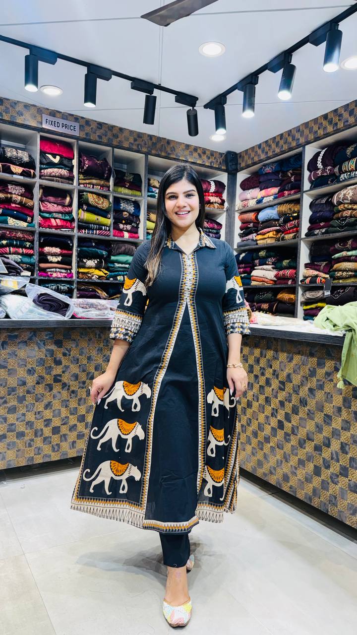 Zarqaa is a bold German Cotton kurta set crafted on a deep Ink Black base, elevated with striking mustard-and-white tiger motifs on the panels. The neckline and hem carry clean geometric borders that give the outfit a sharp, structured finish.