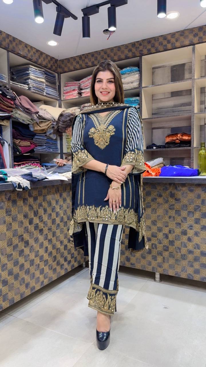 The statement striped pants in navy and ivory add a modern contrast, detailed with embroidered cuffs for a cohesive finish. The matching navy dupatta with a delicate gold border completes the look, balancing elegance with sharp definition. Structured, festive, and unapologetically regal — made for standout occasions.