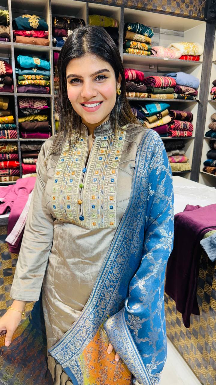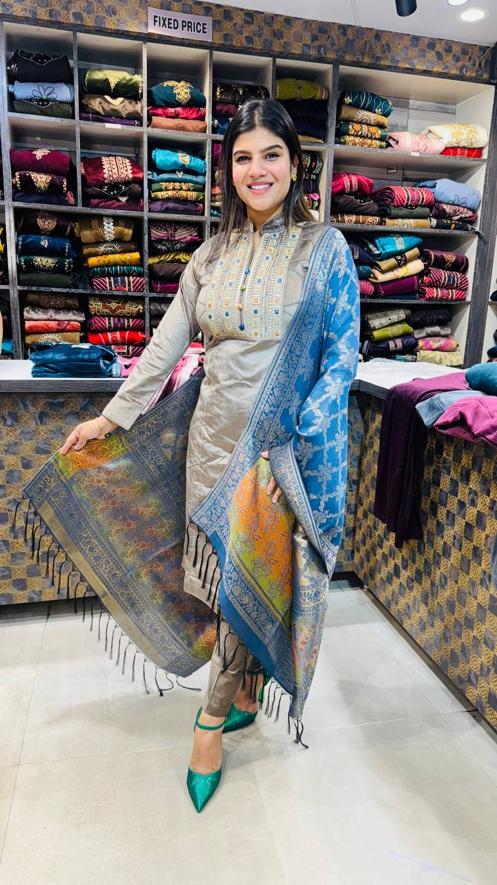 Grace meets grandeur in this premium cotrize ensemble paired with a luxurious Banarasi dupatta. The soft beige-grey base is adorned with elegant thread and mirror work on the neckline, while the vibrant dupatta in royal blue and gold adds a regal pop of colour. A perfect fusion of subtle sophistication and festive charm.
