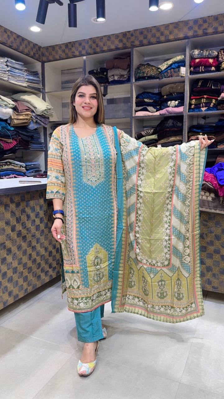 Zayvera is a Premium Maslin 3-Piece ensemble crafted in a refreshing turquoise-teal base with soft olive and beige detailing. The shirt features intricate printed panels along the neckline and borders, blending traditional motifs with a refined vertical layout that elongates the silhouette. The matching dupatta carries coordinated ornamental patterns with a structured border finish, adding depth and graceful movement. Lightweight yet polished, this set is designed for elegant day wear, festive lunches, and graceful gatherings.