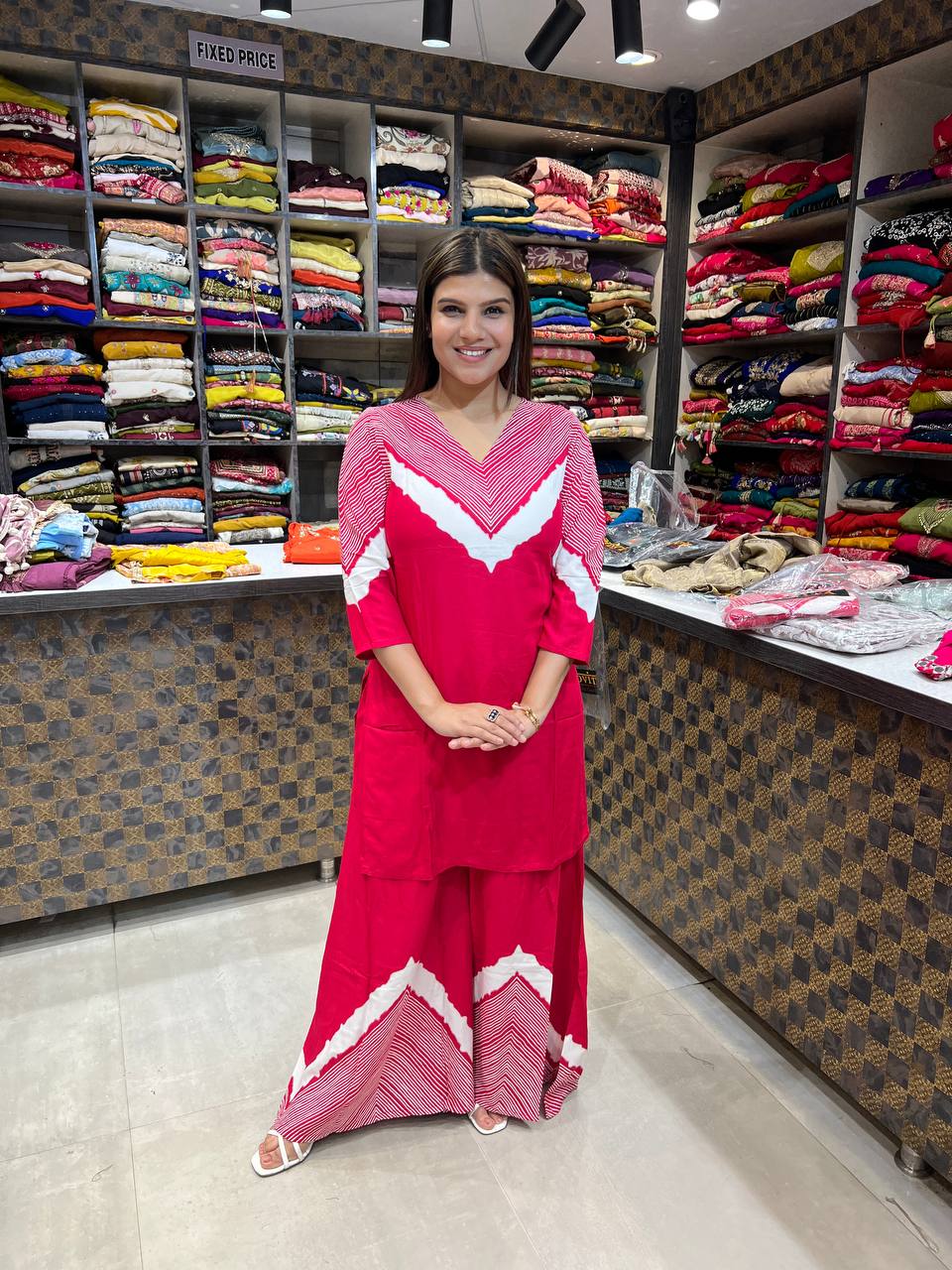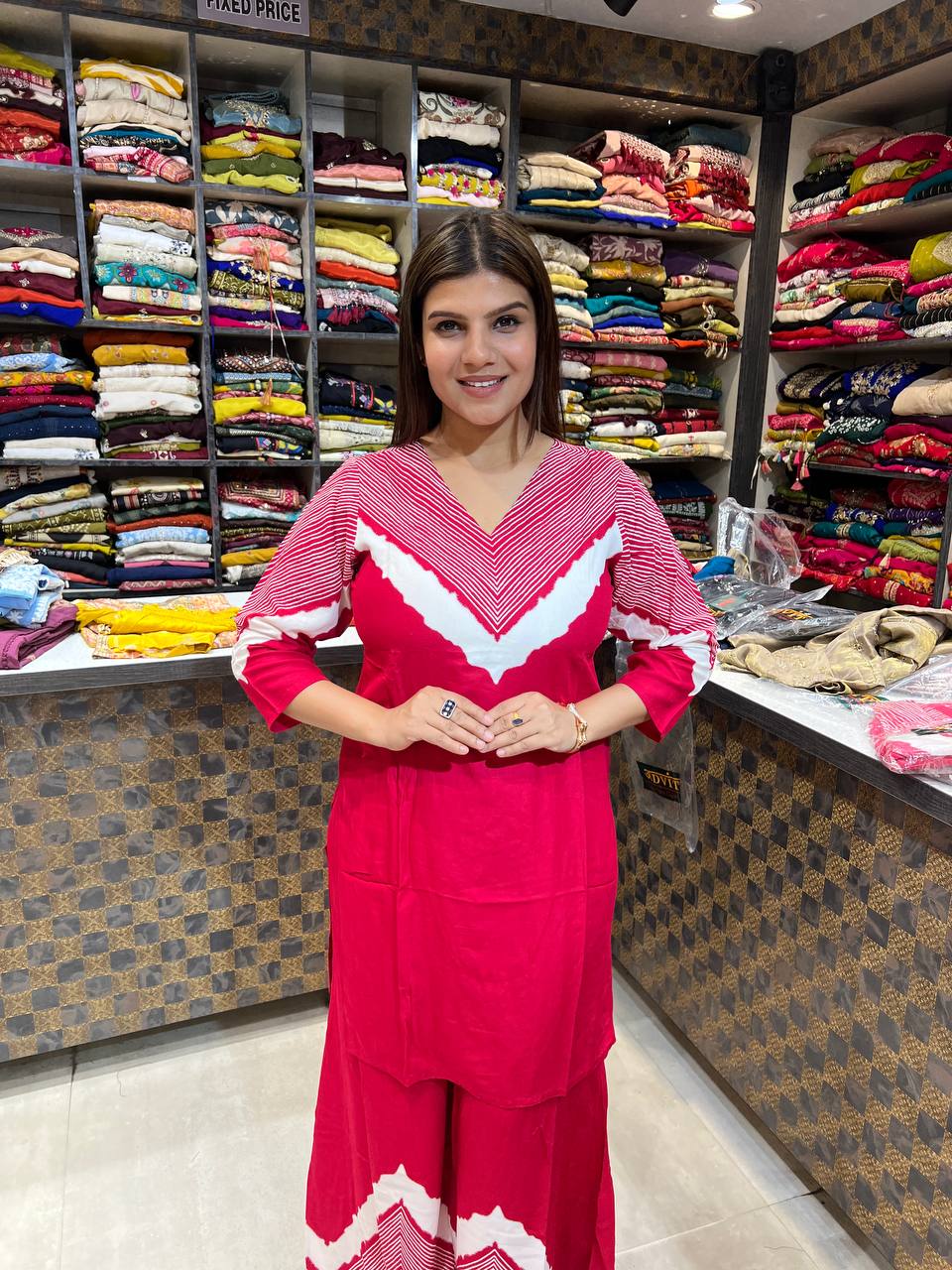 🎨 Colour: Vibrant Red with White Chevron Pattern
