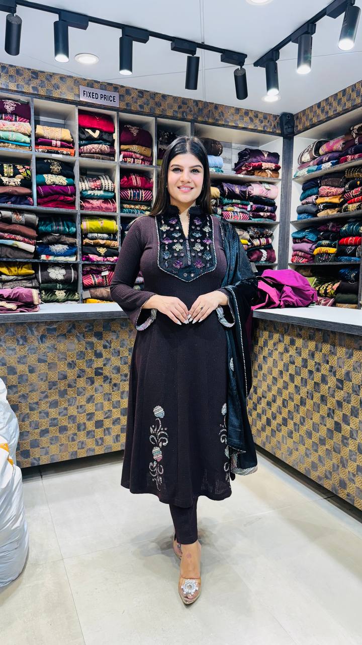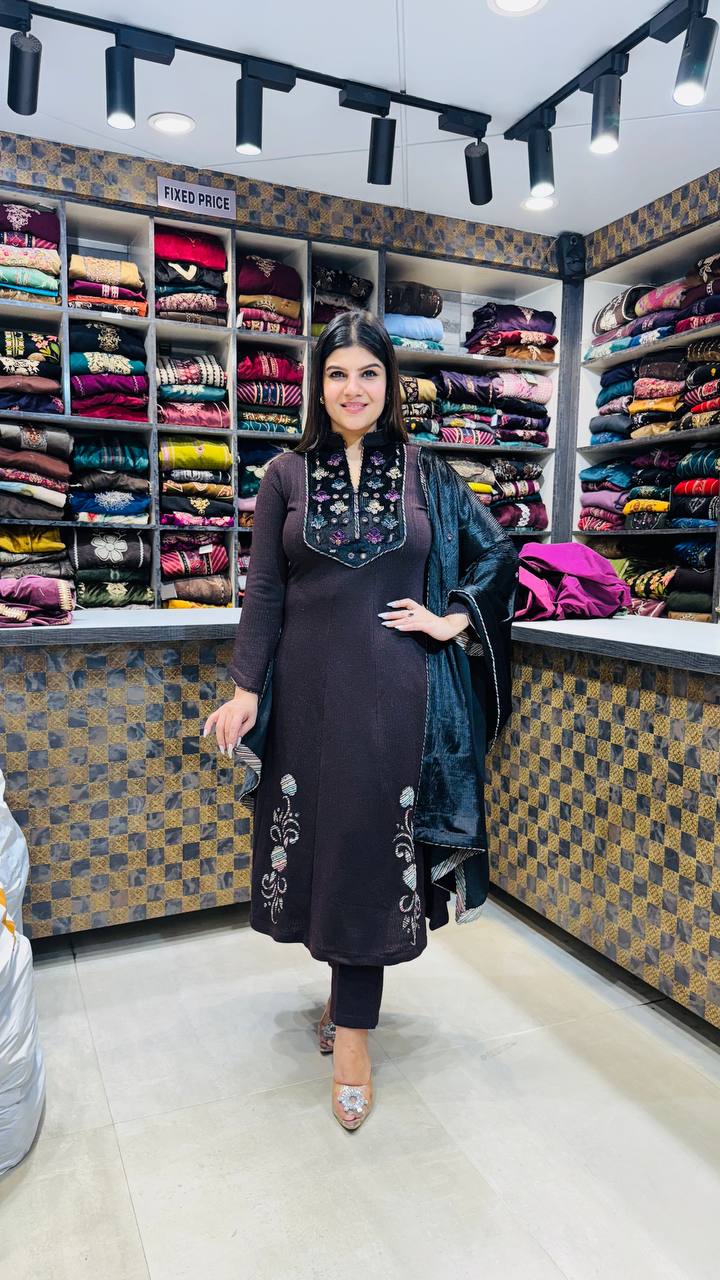 Zuhayra is a rich Chocolate Brown Premium Knitted 3-piece suit crafted for a warm, refined winter look. The shirt comes with a soft ribbed texture and beautifully detailed multi-coloured floral embroidery on the neckline, sleeves, and daman.